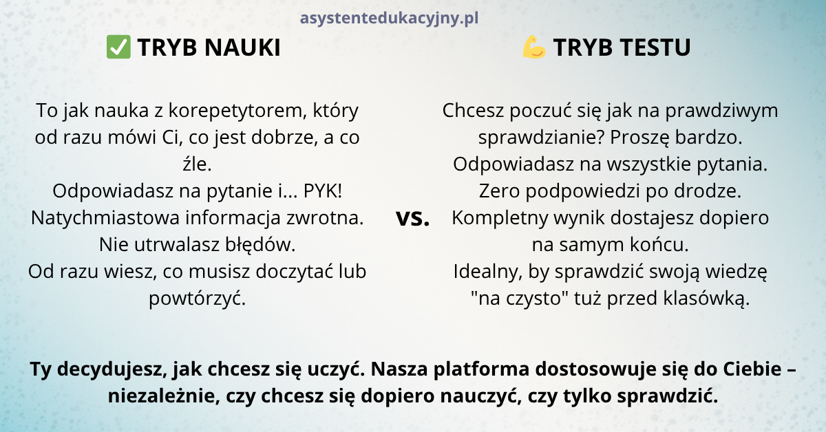 Drugi z trybów jest dla nas szczególnie ważny - tryb nauki. Chcemy, żeby quizy były częścią procesu nauczania. Nie muszą one służyć ocenianiu, ale raczej kontroli, czy uczeń zapamiętał to co ważne. Pozwala to na zdecydowanie czy materiał powinien być powtórzony czy możemy iść dalej do kolejnych zagadnień. Ten tryb jest też częścią procesu w którym używamy (i będziemy używać jeszcze więcej) sztucznej inteligencji. To na podstawie quizów i wyników, będziemy dostosowywali materiał i kolejne zadania do możliwości ucznia.
